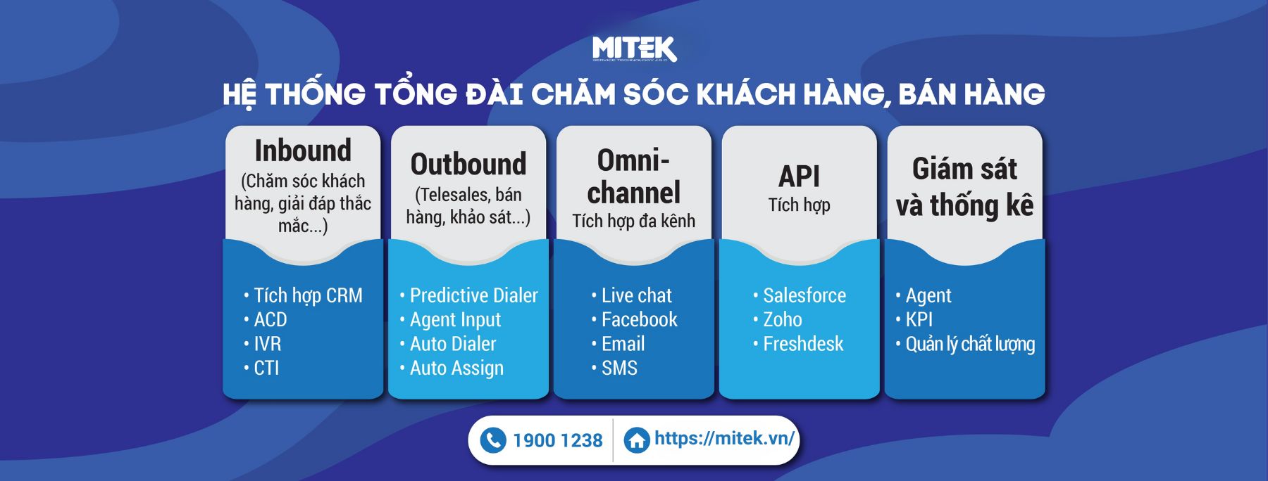 Với thế mạnh là một công ty công nghệ, cùng nhiều năm kinh nghiệm trong lĩnh vực chăm sóc khách hàng, MITEK đã đồng hành cùng hơn 500 công ty lớn nhỏ trên toàn quốc như TTC, Thaco, Generali, ACBs, Transcosmos, J&T Express, ví Momo,….. và hơn 50 đối tác trong và ngoài nước.
