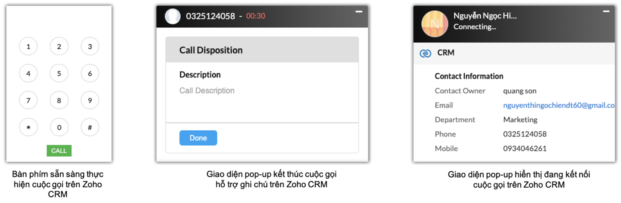 các giao diện pop-up được tích hợp trên màn hình Zoho CRM, hỗ trợ Agent thực hiện các thao tác tiếp nhận và xử lý cuộc gọi với khách hàng.