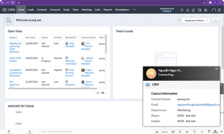 Tự động mở pop-up và hiển thị đầy đủ thông tin khách hàng trên màn hình Zoho CRM khi nhân viên chăm sóc khách hàng thực hiện thao tác tiếp nhận và xử lý cuộc gọi.