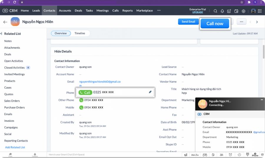3. Thực hiện cuộc gọi cho khách hàng với một thao tác Click chuột trên Zoho CRM