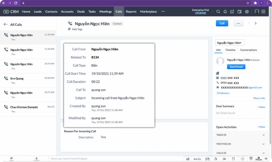4. Tự động ghi lại nhật ký cuộc gọi giữa nhân viên với khách hàng trên Zoho CRM