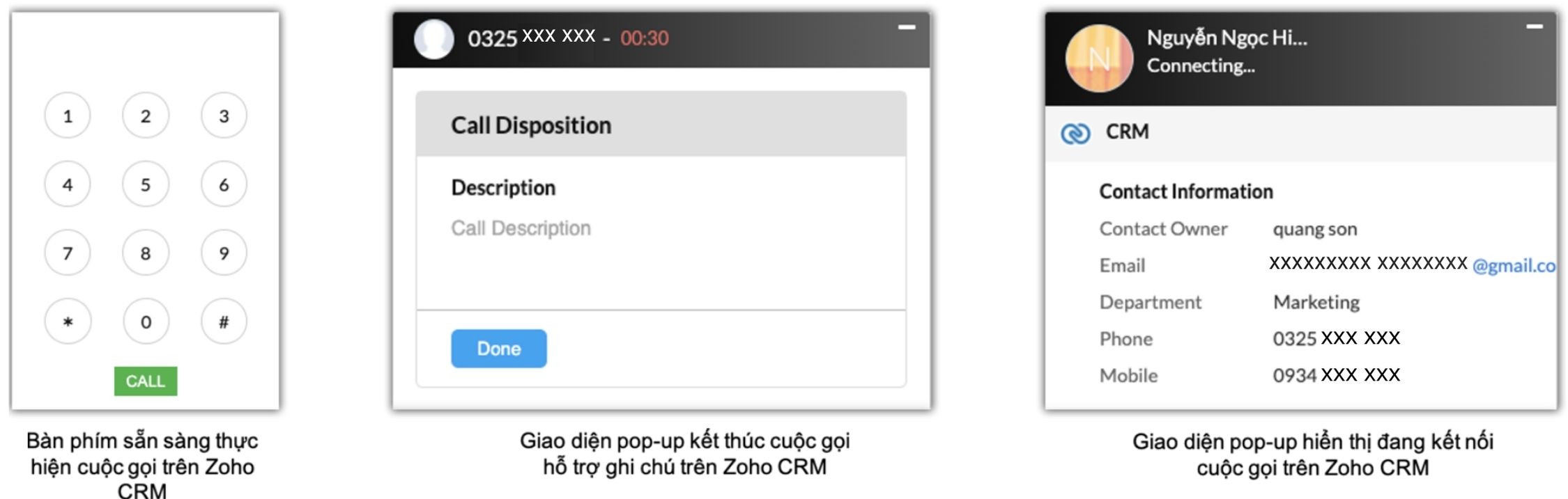 các giao diện pop-up được tích hợp trên màn hình Zoho CRM, hỗ trợ Agent thực hiện các thao tác tiếp nhận và xử lý cuộc gọi với khách hàng.