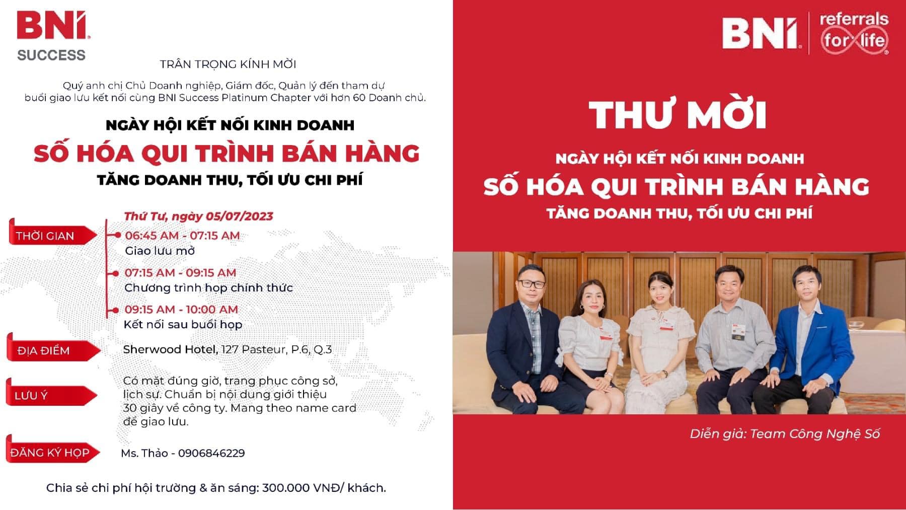 Nếu bạn là nhà doanh nghiệp đang muốn trau dồi thêm kinh nghiệm cũng như tìm kiếm bạn đồng hành trên con đường chuyển đổi số, hãy tham gia ngay sự kiện “Số hoá qui trình bán hàng: tăng doanh thu – tối ưu chi phí” cùng BNI Success.