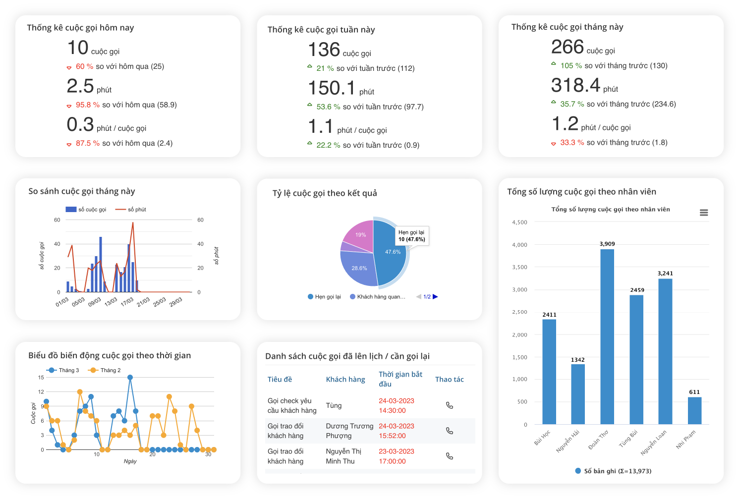 Hỗ trợ hầu hết các báo cáo về cuộc gọi trên phần mềm. Giúp người quản lý dễ dàng kiểm soát và đánh giá hiệu quả gọi điện của nhân viên.