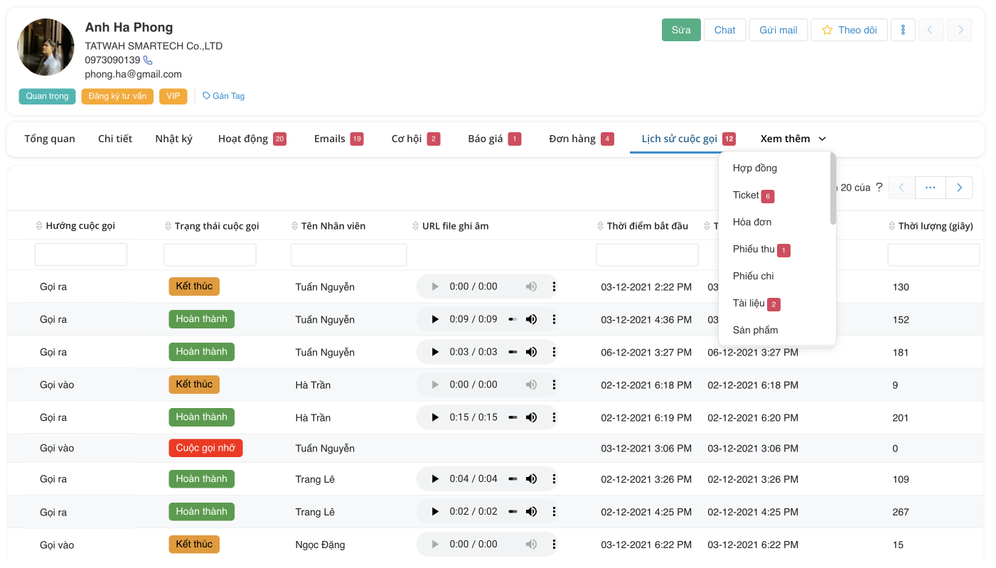 Tất cả các lịch sử cuộc gọi (gọi ra, gọi vào, gọi nhỡ, hẹn gọi lại…) đều được ghi nhận vào hồ sơ khách hàng tương ứng trên phần mềm.