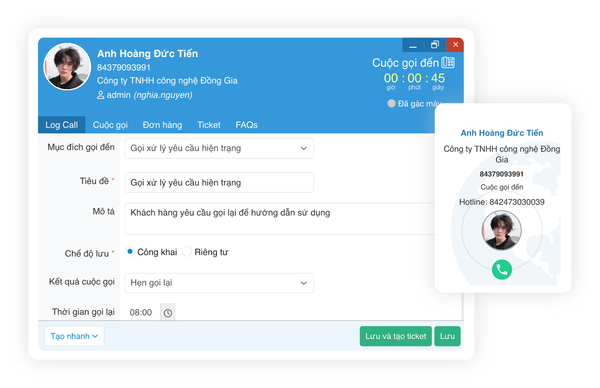Trong quá trình gọi điện nhân viên có thể tạo các hoạt động ngay trên phần mềm như: Tạo cuộc hẹn, cuộc gọi, tạo đơn, tạo ticket và điều phối.