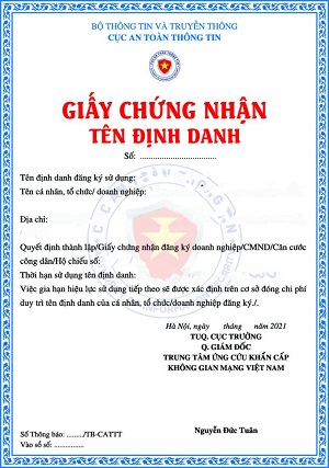 Giấy chứng nhận tên định danh sẽ được cấp phép bởi Bộ Thông tin và Truyền thông (Cục An toàn thông tin).