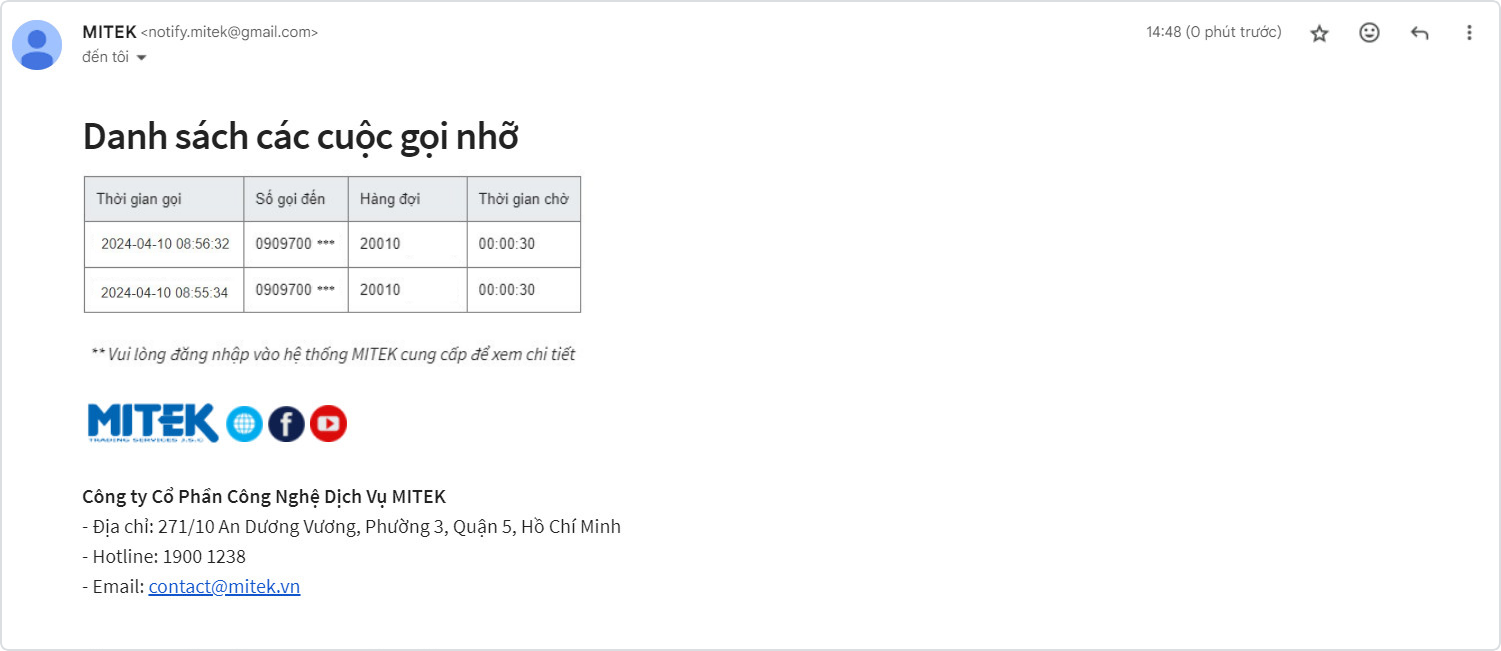 Trong Email thông báo cuộc gọi nhỡ sẽ bao gồm các thông tin như: thời gian khách hàng gọi đến, số điện thoại của khách hàng và hàng đợi tiếp nhận bị nhỡ, thời gian chờ