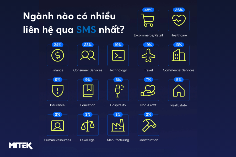 Có thể thấy, đa dạng các ngành như Tài chính, Bán lẻ, Chăm sóc sức khỏe, dịch vụ công cộng,… đều tận dụng SMS Brandname để gửi thông báo, xác nhận giao dịch, quảng cáo và dịch vụ chăm sóc khách hàng.