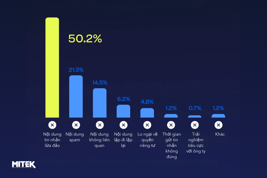 Những lý do chính khiến người tiêu dùng đăng ký nhận tin nhắn kinh doanh: nhắc nhở cuộc hẹn/đặt chỗ, theo dõi lô hàng, chương trình khuyến mãi, và thông báo bán hàng.