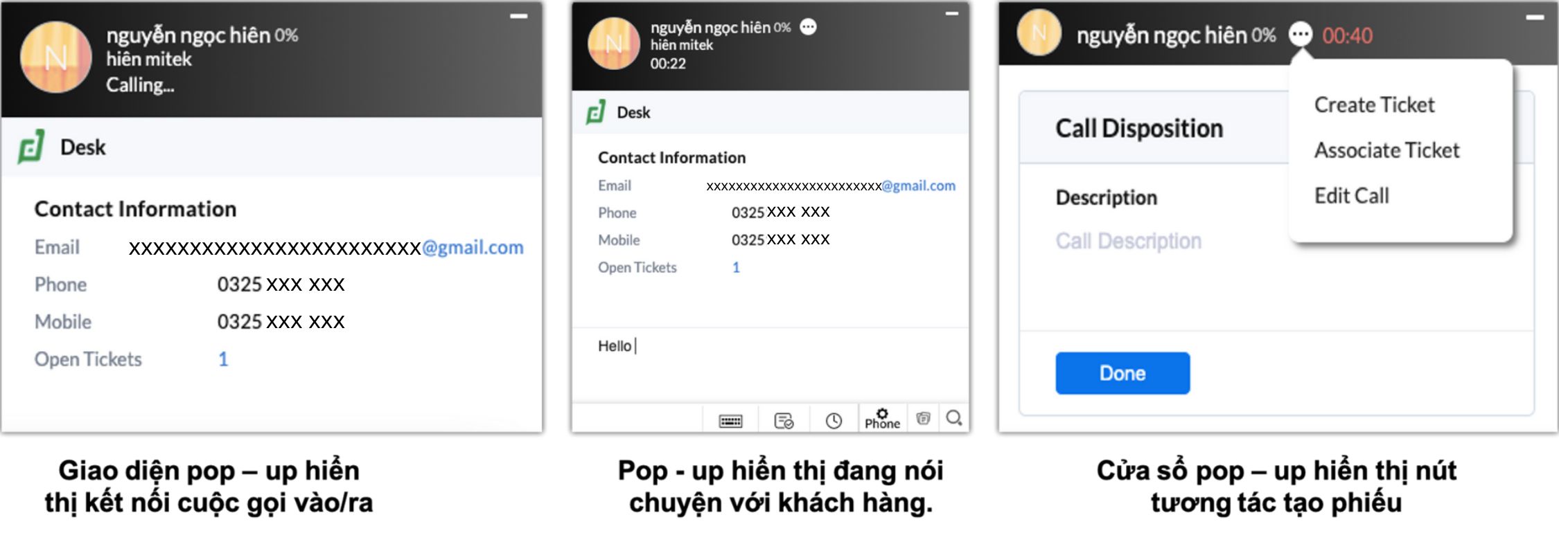 2. Tự động mở Pop-up hiển thị thông tin khách hàng khi có cuộc gọi trên hệ thống Zoho Desk