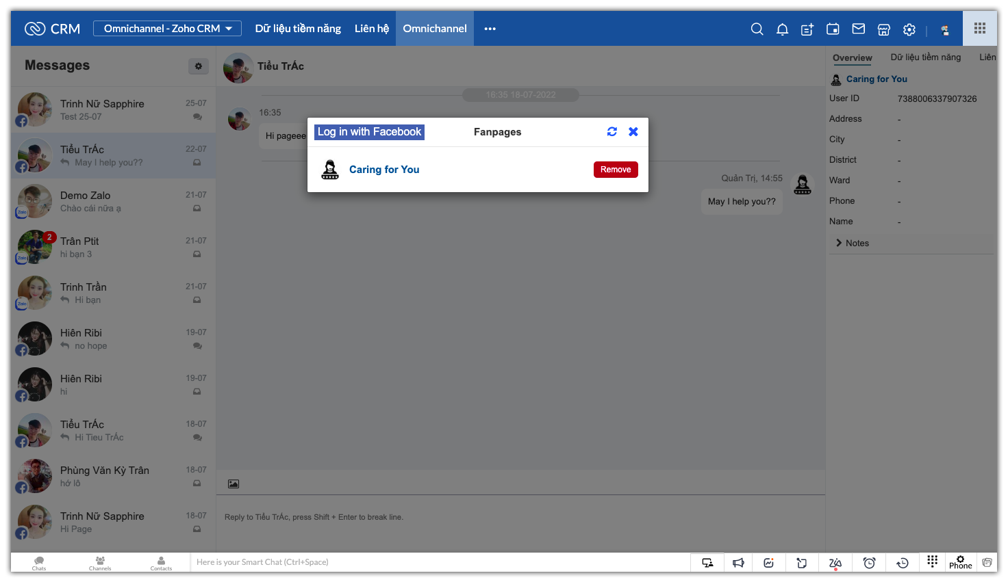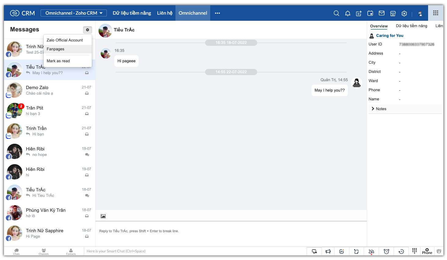 3. Dễ dàng tiếp nhận, xử lý và quản lý lịch sử tương tác các kênh Facebook, Zalo OA trên Zoho CRM: