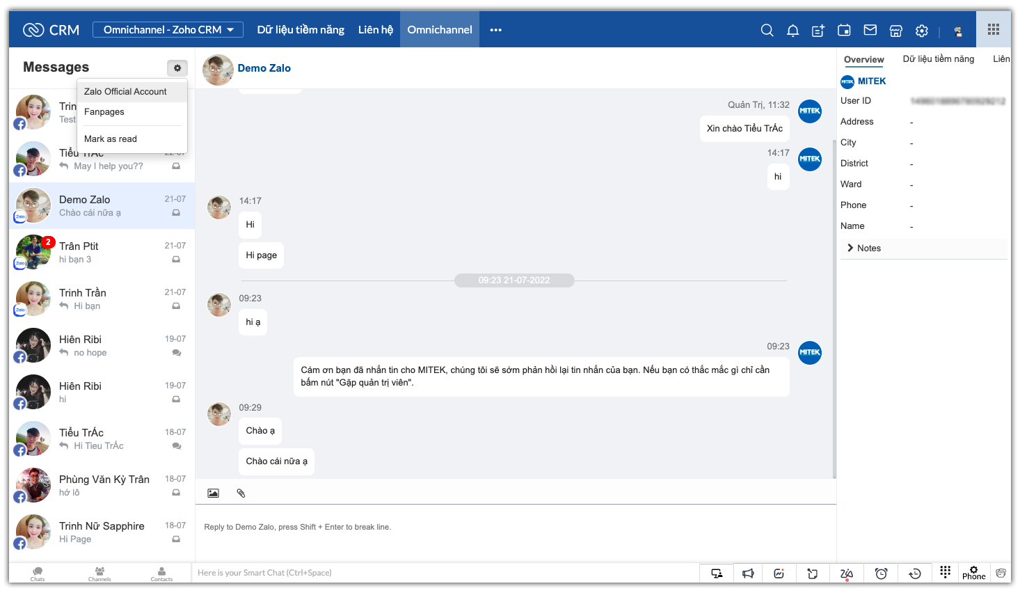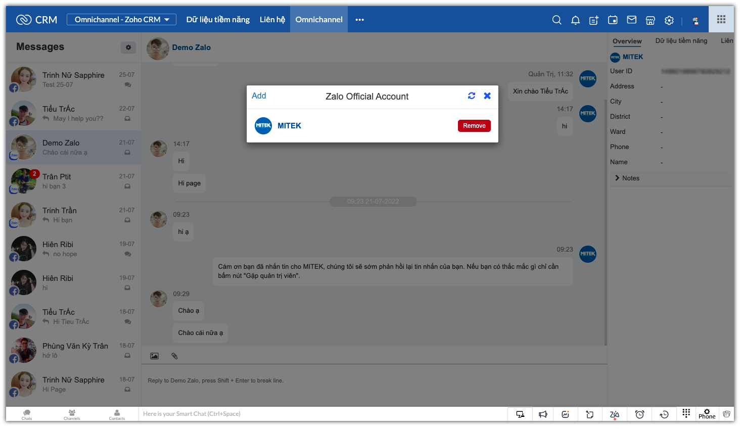 Một số tính năng của giải pháp tích hợp Facebook, Zalo OA vào Zoho CRM